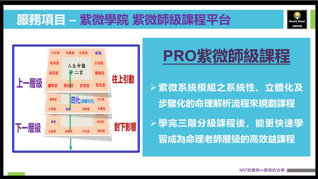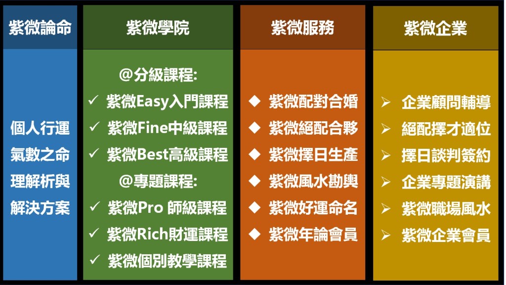 - 紫微師級學院: 針對欲更精準全方位論斷命盤或有志成為命理老師所規劃之師級課程,乃學完三階分級課程後,能更快速學習成為命理老師層級的高效益課程平台